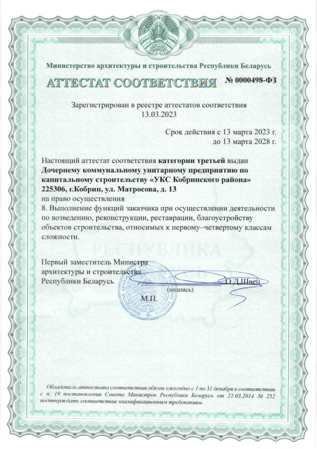 По договорам на оказание услуг по комплексному управлению строительной деятельностью Унитарное предприятие «УКС Кобринского района» принимает решения от имени заказчика, застройщика во взаимоотношениях с подрядчиками, а также обеспечивает достижение основных технико-экономических характеристик объекта строительства, в том числе предельной стоимости строительства (бюджета проекта) и соблюдение сроков завершения строительства.